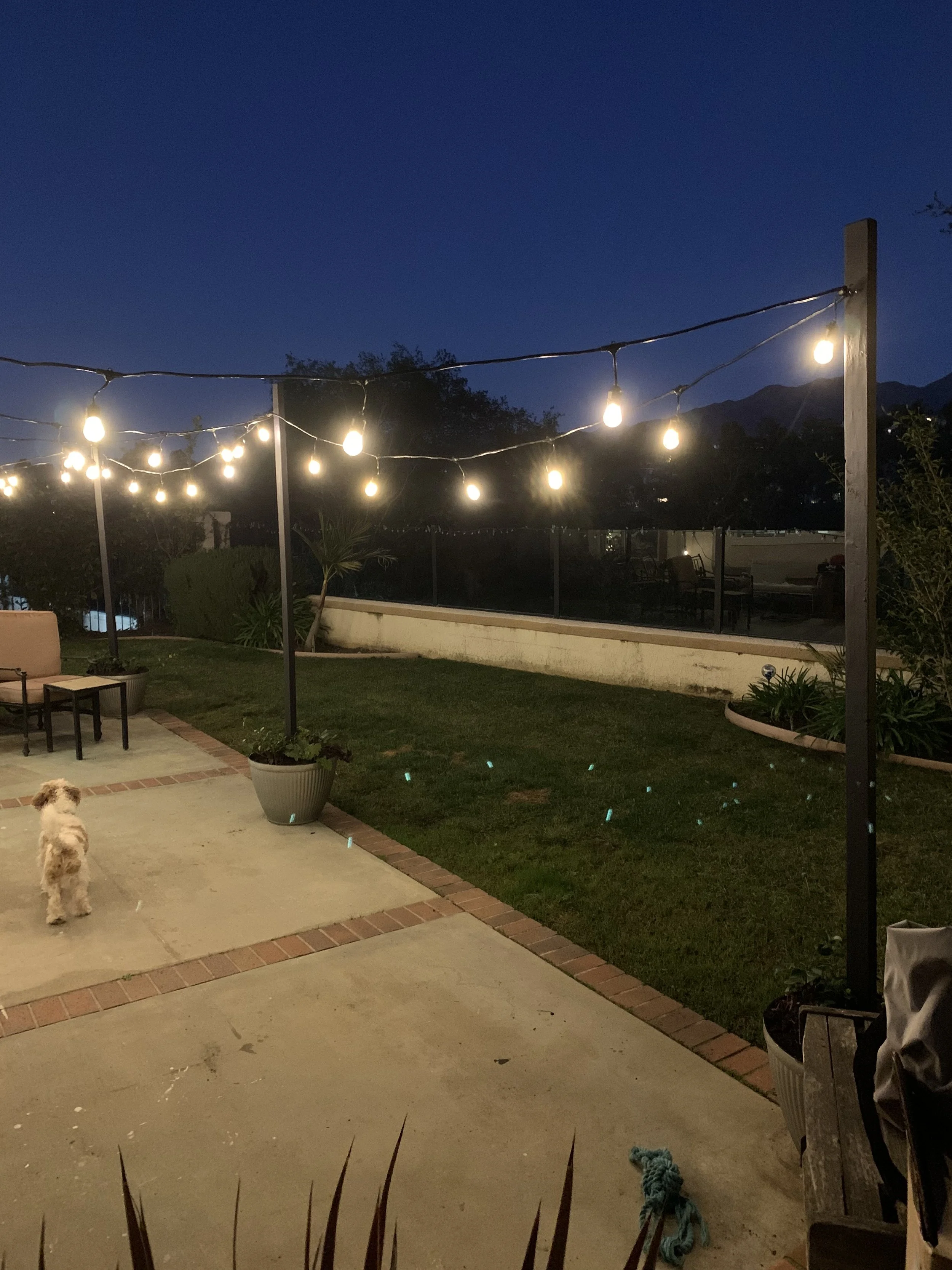 Disclosure: Our patio is small. If you have a larger area you want to light up, please purchase wiring to hold the lights. You’ll have to purchase poles as well to get the lights up higher and to install them to an outdoor structure/fence. We didn’t do this because we were working in a smaller area and only used two strands of lights. Also we live in Southern California and don’t have snow, we have very little rain, and only a few times a year do we have wind in which we will need to remove the lights. We can easily remove them at this time.